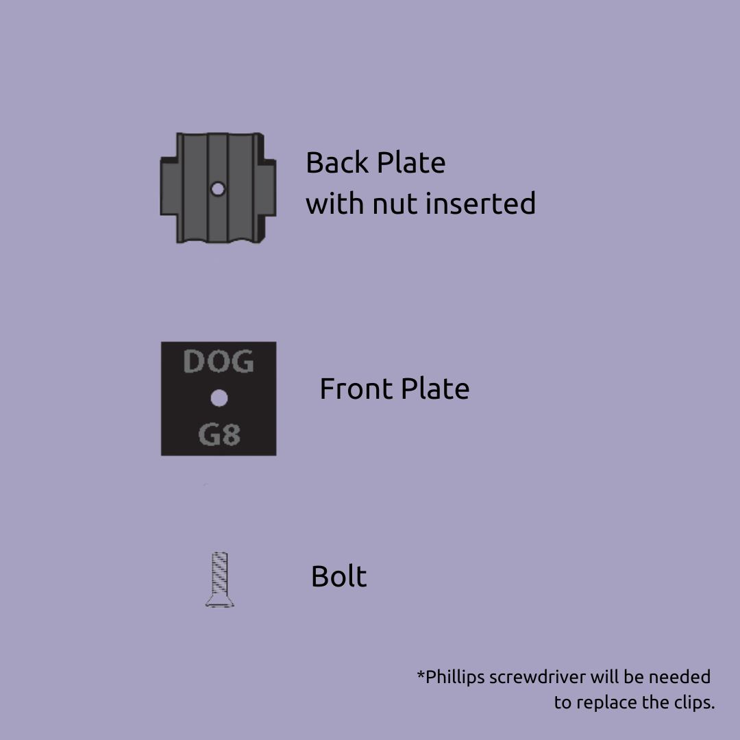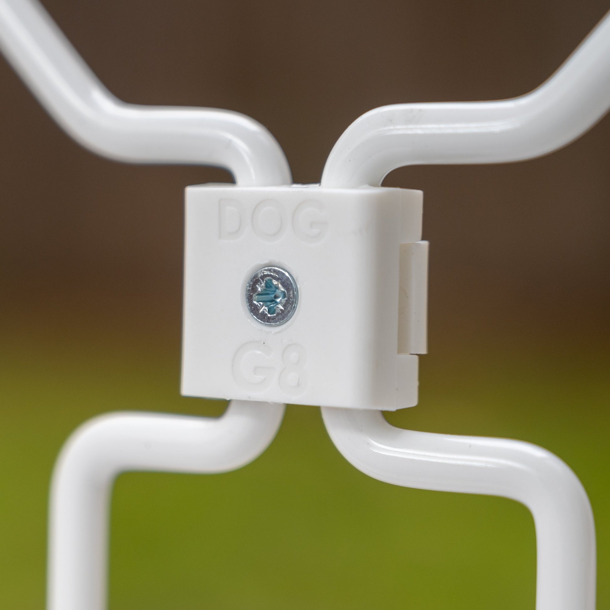 Spare Black or White joining clip. They are made from nylon plastic, with a centre chrome locking nut and bolt. Dog-G8 Clips join the gate's metal work together and allow for the concertina movement. Multiples are available, please adjust quantities.